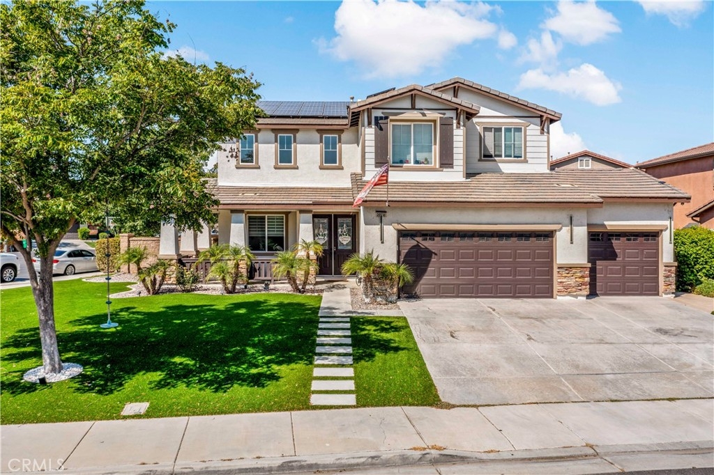 Welcome Home to this lovely Corner Culdesac Model like Home, This Eco friendly home has been upgraded with SMART technology, SOLAR System, and New TURF front and back. No expense spared on exterior or Interior this home is stunning. Upon entering the front door you’ll find vaulted ceilings and an open concept spacious formal living and dining room. The Generous size family room open to the upgraded kitchen flowing together make an amazing space for entertaining, The oversized kitchen is a chef's dream with upgraded quartz counters and backsplash, cabinetry, stainless steel appliances and a large center island with room to entertain. This home features a downstairs room, could be 5th bedroom and 3/4 bath, Upgraded shower. Great option for guests or office space. Upstairs features 4 bedrooms, a spacious loft, and two full bathrooms. New Laminate floors through out, with complimented 6” modern base boards and casings. Beautiful 76”Ceiling Fans. Enjoy reduced utility bills, Smart LED lights throughout entire house. The master suite has lots of natural light, an oversized closet and master bath with dual sinks, upgraded walk in shower, and soaking tub. Enjoy your outdoor living area with New modern custom fire pit and Planters, a perfect yard for entertaining and large gatherings,. Don't forget to bring your toys as there is plenty of storage in the large 3 car garage. This GATED Lakes community offers fishing lakes, pools, water slides, a splash pad, parks and lots of walking trails. Come see all that the amazing community of The Lakes has to offer!
