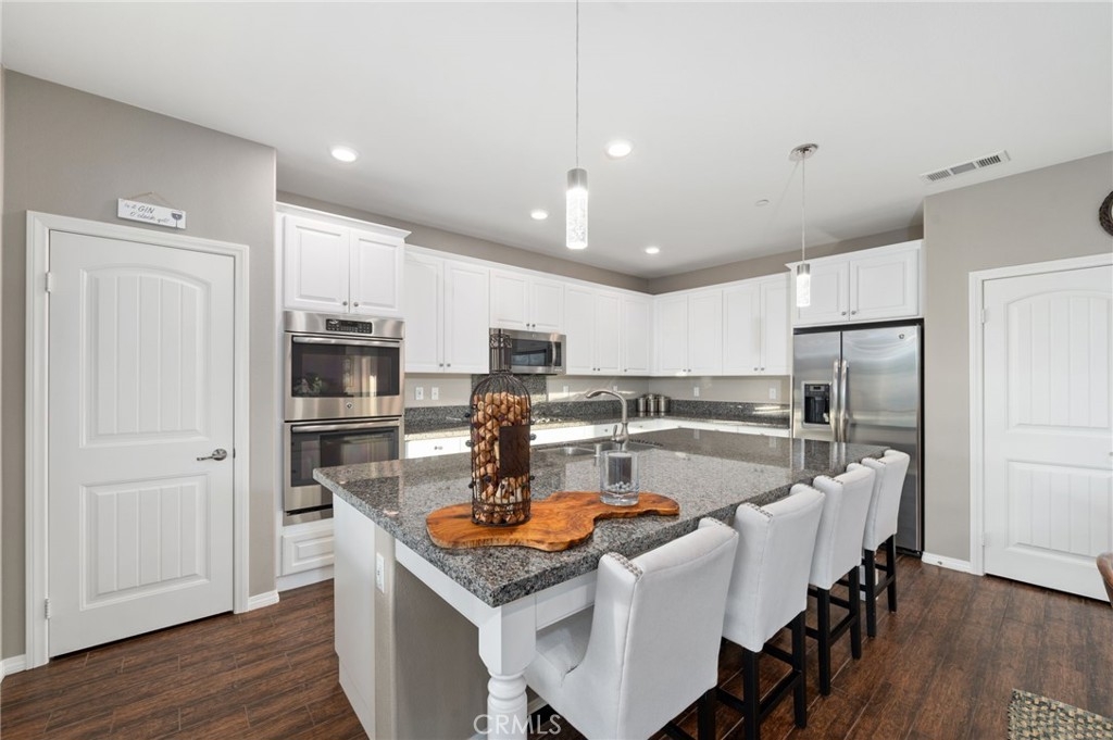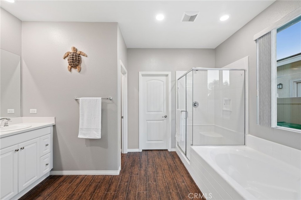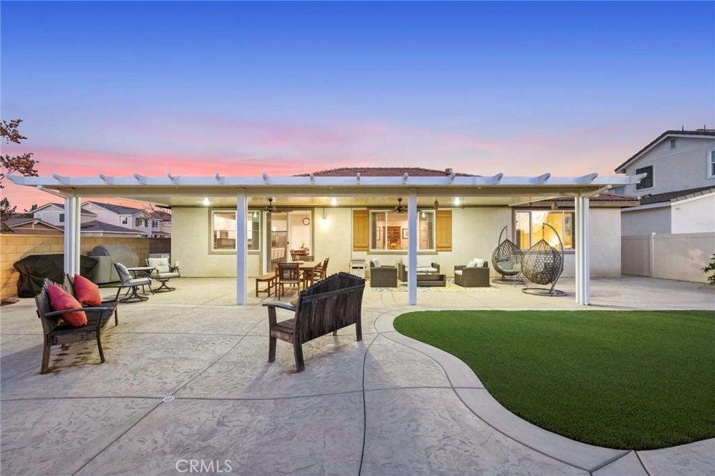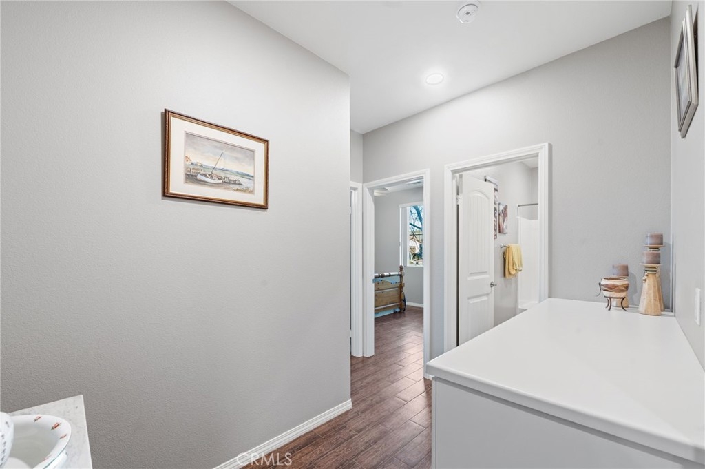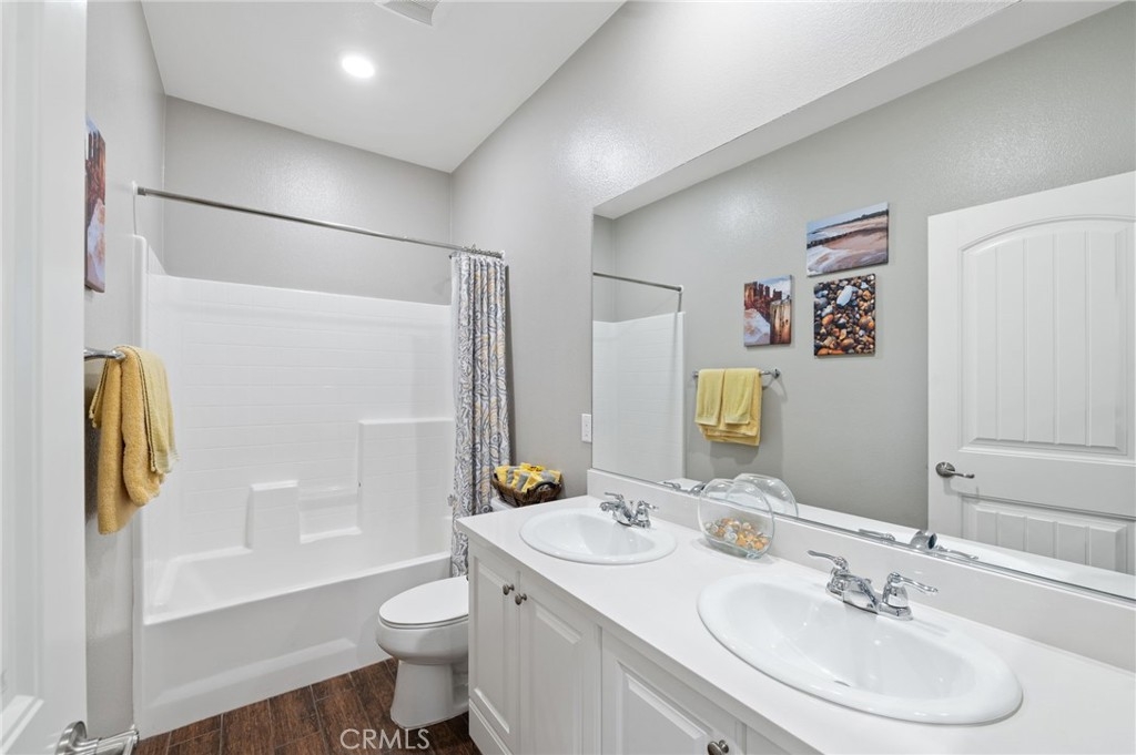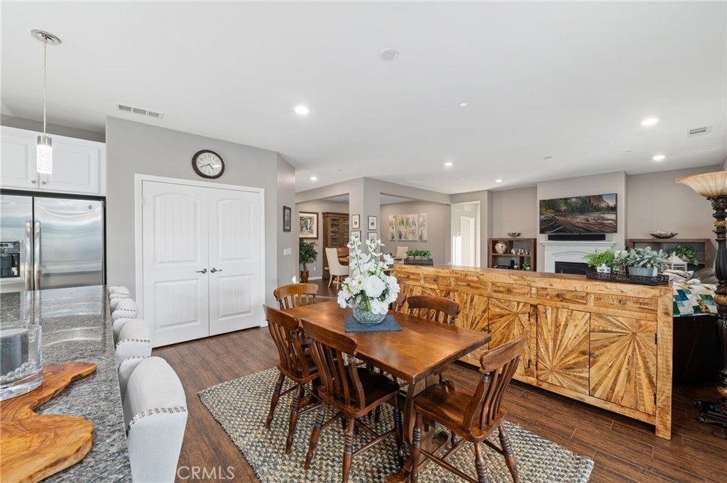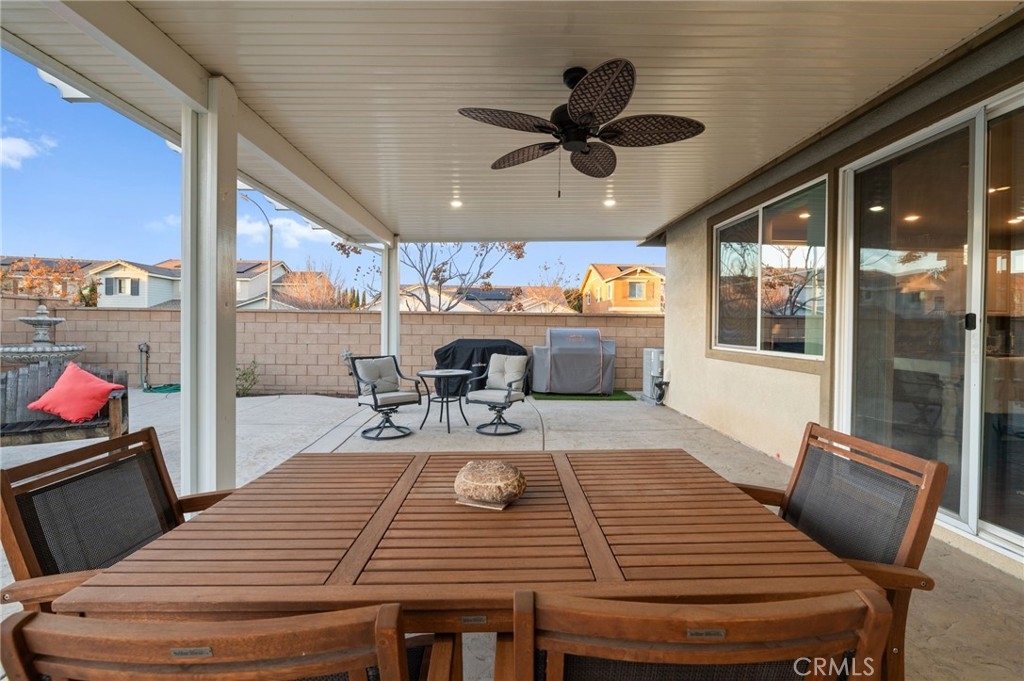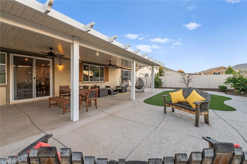Welcome to your dream oasis in The Lakes, a prestigious gated community nestled in the heart of Menifee, California. Step into luxury as you enter this single-story home, perfectly situated on a corner lot for added privacy and curb appeal. With 3 bedrooms and 2 bathrooms, this residence offers a seamless blend of elegance and functionality. As you step inside, you're greeted by an inviting open floor plan with exquisite wood plank tile floors throughout, creating an ambiance of warmth. The spacious living room sets the stage for relaxation, complete with a fireplace, ideal for cozying up during chilly evenings. The heart of the home lies in the spacious kitchen, featuring a large island, stainless steel appliances, double oven, granite countertops, and a gas cooktop. Entertain with ease as the kitchen seamlessly flows into the dining area, offering the perfect space for hosting intimate gatherings or family meals. Off the kitchen, discover a versatile bonus room or den, providing endless possibilities for a home office, playroom, or an additional bedroom to suit your needs. Retreat to the primary suite, where the ensuite bathroom features a separate tub and shower, dual sink vanity, and a walk-in shower, offering a serene sanctuary to unwind after a long day. Two additional bedrooms and a secondary bathroom with a dual sink vanity ensure ample space for family or guests. Step outside to your own private paradise and backyard oasis. Lounge under the shade of the alumawood patio cover, equipped with built-in recessed lighting and dual ceiling fans, perfect for enjoying al fresco dining. Delight in the low-maintenance lifestyle with turf grass and savor the sweetness of homegrown fruit from the backyard's fruit trees. The Lakes community offers an unparalleled lifestyle enriched by its three lakes, parks, and walking trails. Residents enjoy an array of recreational amenities, including kayaking, boating, and fishing, while the Bay Club serves as a hub for fitness, leisure, and social gatherings. With its state-of-the-art facilities, including a fitness center, waterslides, swimming pools, spa, and grill/patio area, every day feels like a vacation. Don't miss the opportunity to make this extraordinary residence your new home sweet home. Schedule your private tour today.