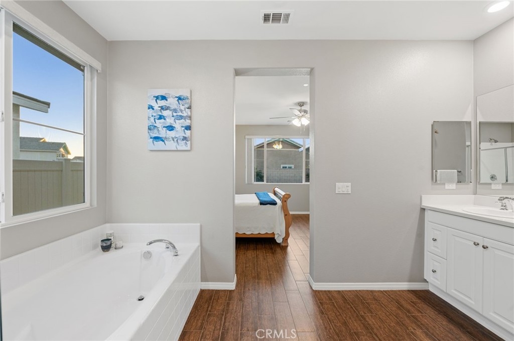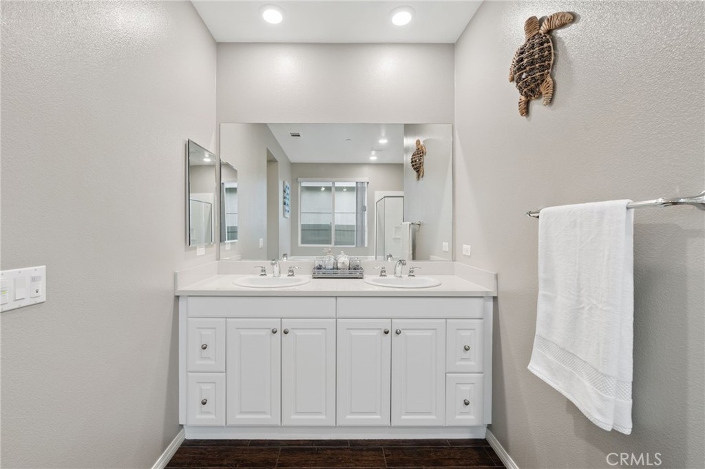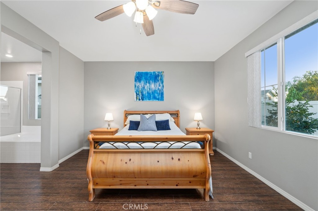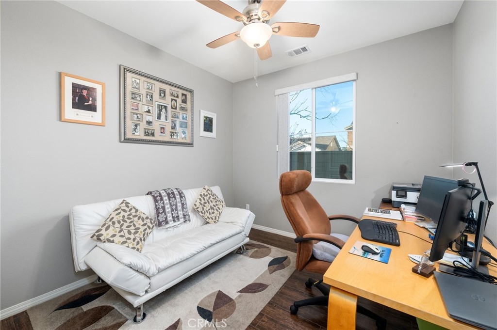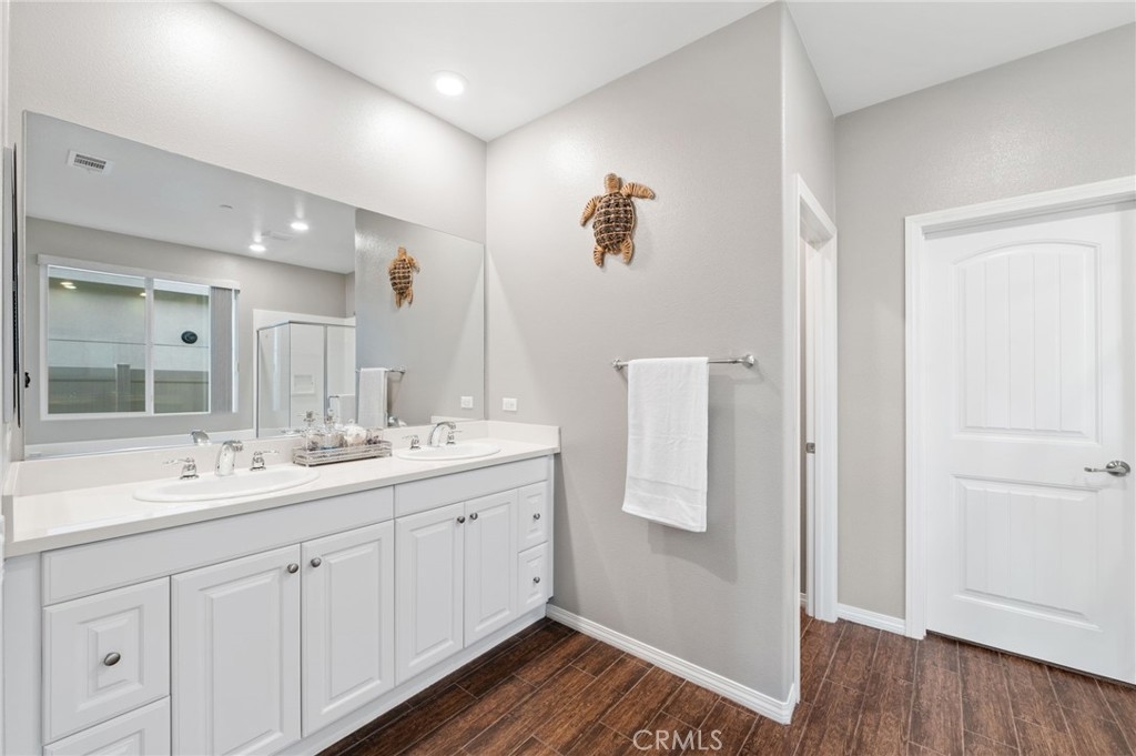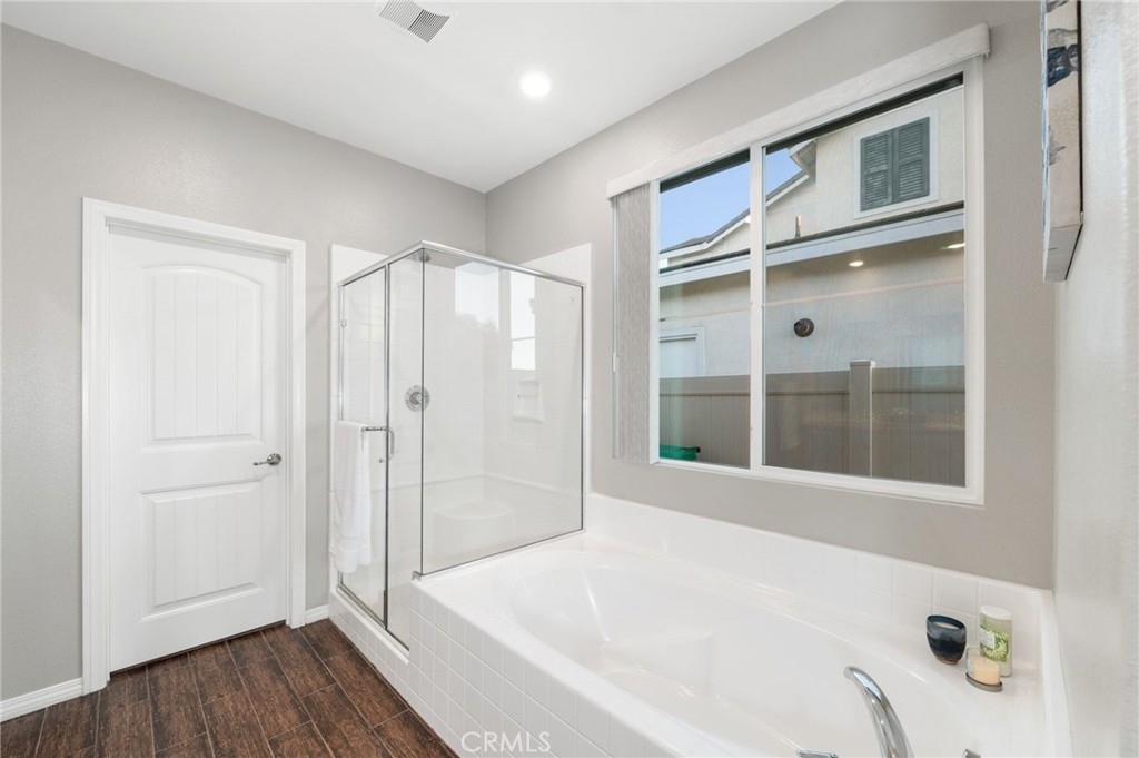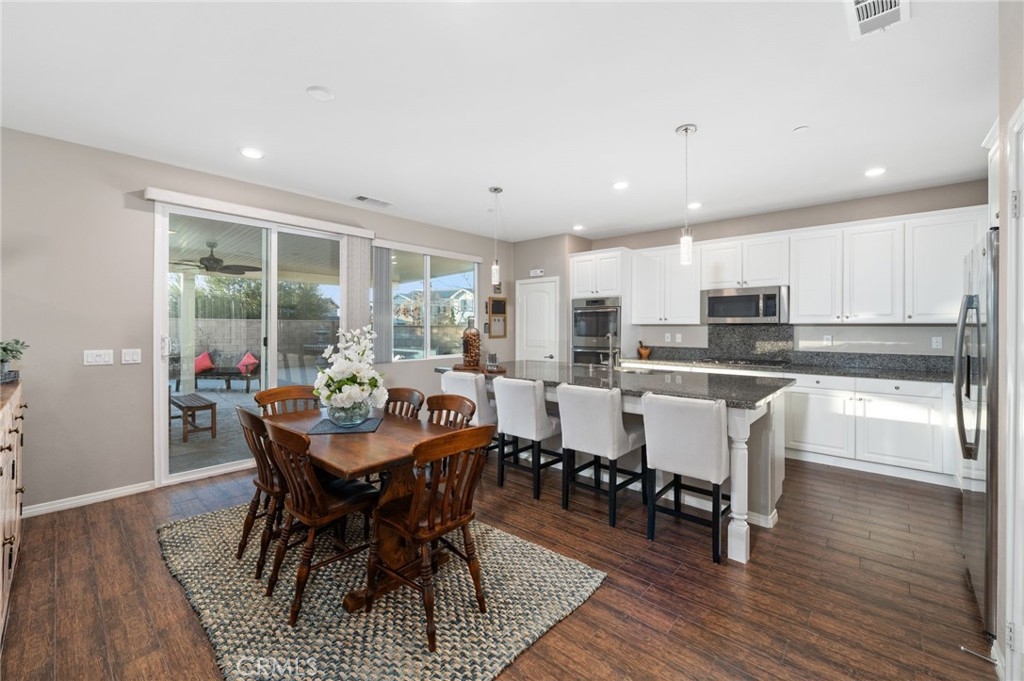 Welcome to your dream oasis in The Lakes, a prestigious gated community nestled in the heart of Menifee, California. Step into luxury as you enter this single-story home, perfectly situated on a corner lot for added privacy and curb appeal. With 3 bedrooms and 2 bathrooms, this residence offers a seamless blend of elegance and functionality. As you step inside, you're greeted by an inviting open floor plan with exquisite wood plank tile floors throughout, creating an ambiance of warmth. The spacious living room sets the stage for relaxation, complete with a fireplace, ideal for cozying up during chilly evenings. The heart of the home lies in the spacious kitchen, featuring a large island, stainless steel appliances, double oven, granite countertops, and a gas cooktop. Entertain with ease as the kitchen seamlessly flows into the dining area, offering the perfect space for hosting intimate gatherings or family meals. Off the kitchen, discover a versatile bonus room or den, providing endless possibilities for a home office, playroom, or an additional bedroom to suit your needs. Retreat to the primary suite, where the ensuite bathroom features a separate tub and shower, dual sink vanity, and a walk-in shower, offering a serene sanctuary to unwind after a long day. Two additional bedrooms and a secondary bathroom with a dual sink vanity ensure ample space for family or guests. Step outside to your own private paradise and backyard oasis. Lounge under the shade of the alumawood patio cover, equipped with built-in recessed lighting and dual ceiling fans, perfect for enjoying al fresco dining. Delight in the low-maintenance lifestyle with turf grass and savor the sweetness of homegrown fruit from the backyard's fruit trees. The Lakes community offers an unparalleled lifestyle enriched by its three lakes, parks, and walking trails. Residents enjoy an array of recreational amenities, including kayaking, boating, and fishing, while the Bay Club serves as a hub for fitness, leisure, and social gatherings. With its state-of-the-art facilities, including a fitness center, waterslides, swimming pools, spa, and grill/patio area, every day feels like a vacation. Don't miss the opportunity to make this extraordinary residence your new home sweet home. Schedule your private tour today.