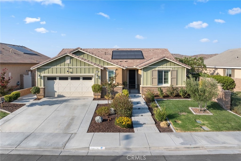 This home also includes a 2-car garage with built-in cabinets, 4 overhead storage racks, and an epoxy-finished floor, offering plenty of storage options. Additionally, the property features builder-installed solar (leased) and fire sprinklers for added efficiency and safety.