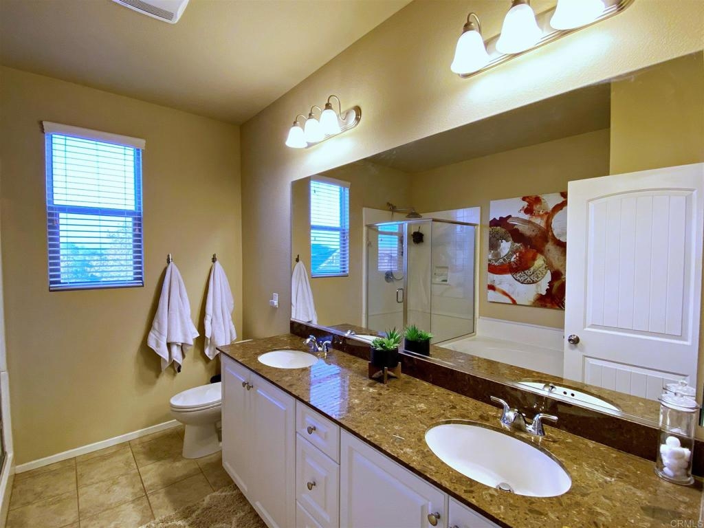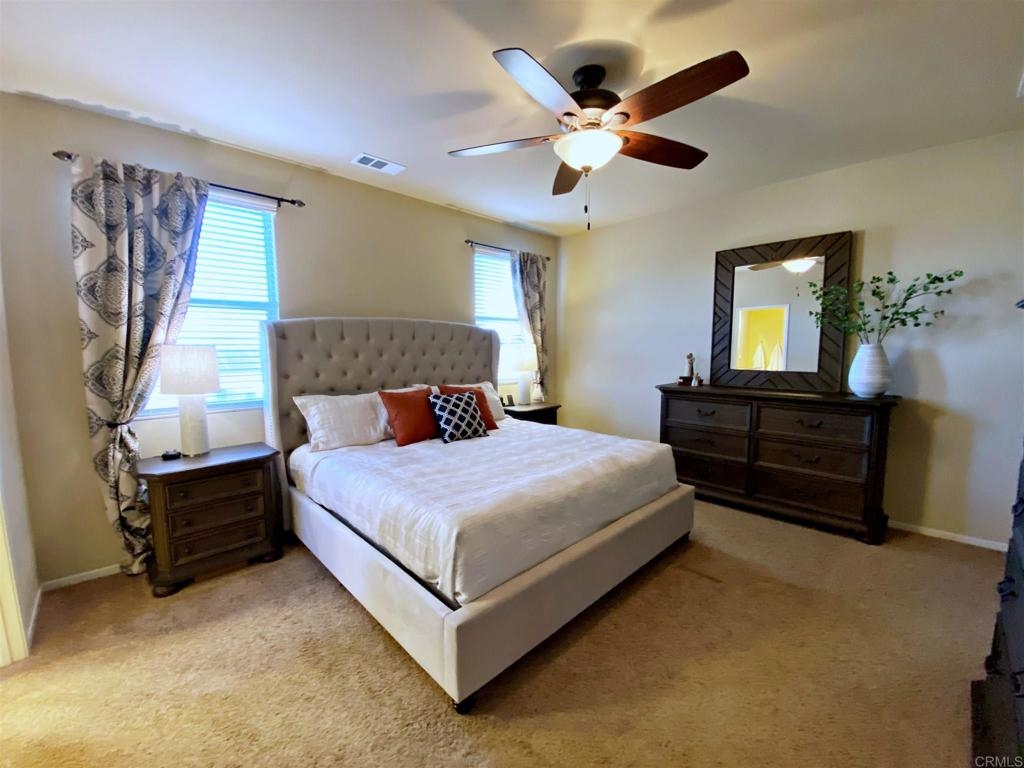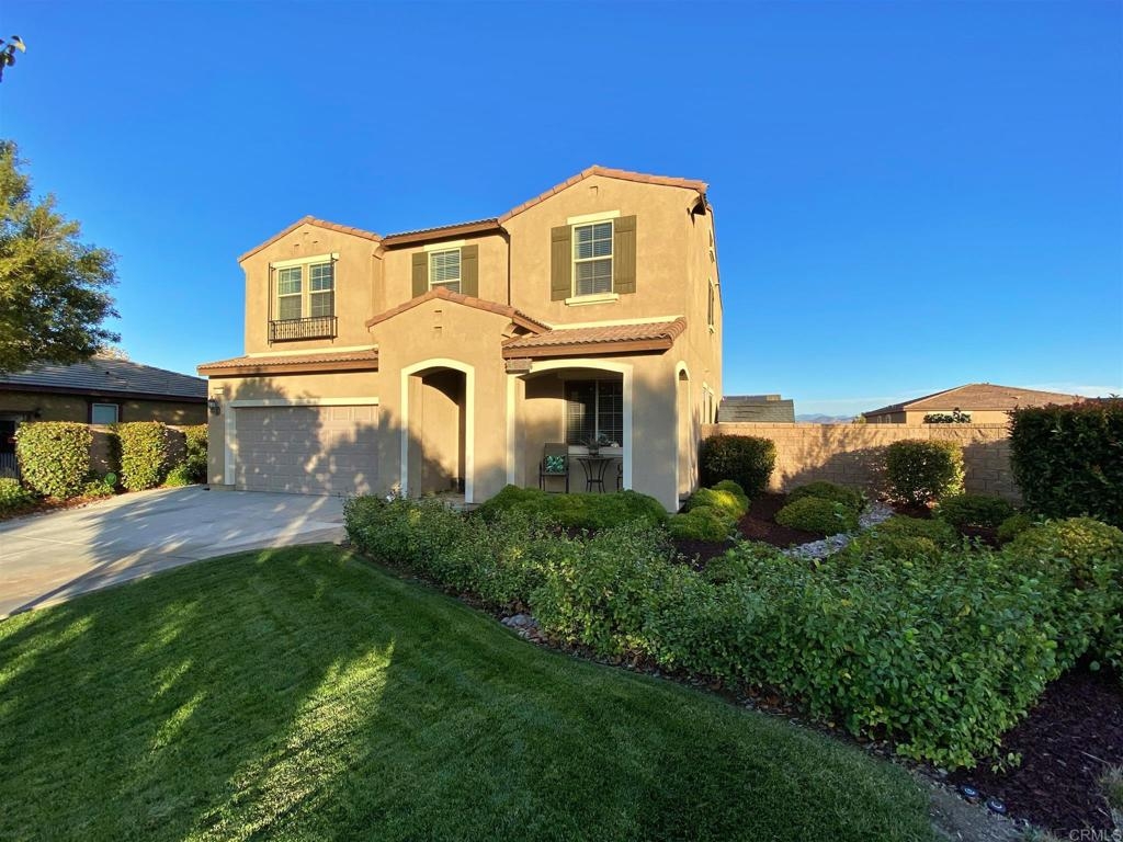 No need to look anymore, you've found your dream home! This spacious cul-de-sac home is located in the highly desirable gated community "The Lakes" and boasts with over 2,200 square feet with its desirable open layout. Come see the versatile floor plan with 4 bedrooms, a loft/game room upstairs, and an office/entry room downstairs. You'll love the open kitchen with gorgeous granite countertops, custom backsplash, walk-in pantry and center island. There are ceiling fans in every room and lots of light throughout the house. The luxurious master bedroom includes a walk-in closet and ensuite bath with double sink vanity, large walk-in shower and separate tub. Save time and energy with the upstairs laundry room where all your bedrooms are. You'll want to spend time relaxing outside around the firepit and enjoy your view of the mountains and the oversized back yard! The garage floor is easy to keep clean with a smooth epoxy finish. Your just steps away from the kids playground not to mention all the other amenities The Lakes has to offer with 2 pools, water slide, splash pad, gym, fishing, BBQ, trails, clubhouse, gated community and more. Minutes from shopping, dining and the 215 freeway. Call and schedule your showing today!